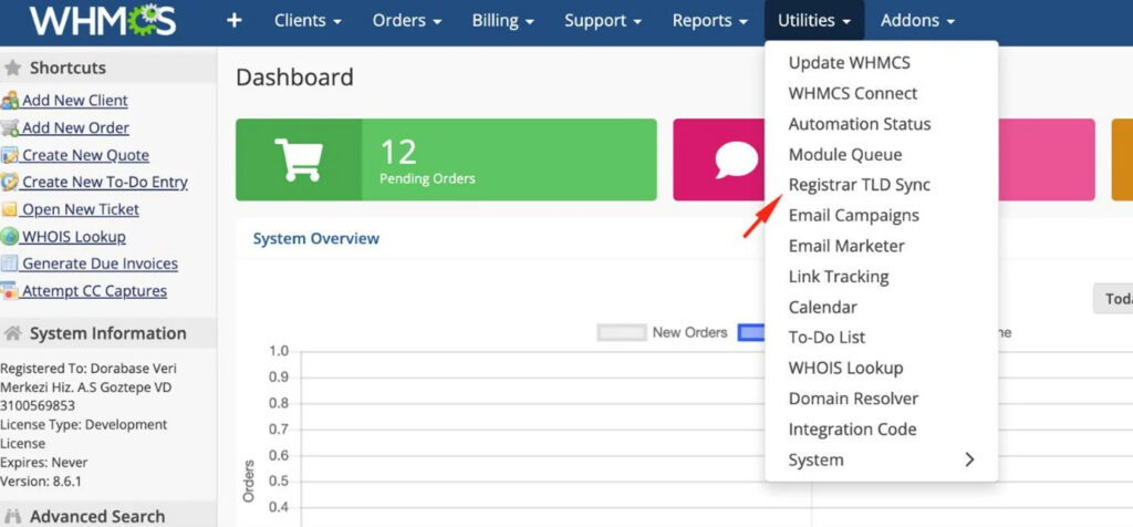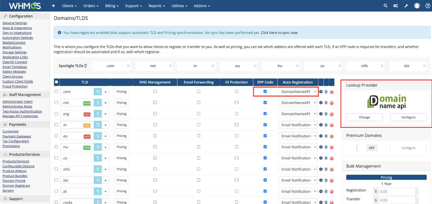 Go to Registrar TLD Sync from Utilities section. Select “DomainNameApi” from the screen that comes up, wait a bit.
