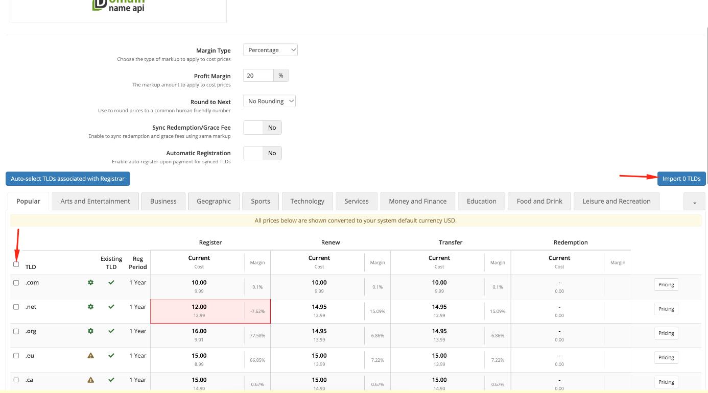 On the next screen, all tlds in our system are cross-compared with all tlds on whmcs, profit margin and loss are calculated and displayed in bulk, allowing import.