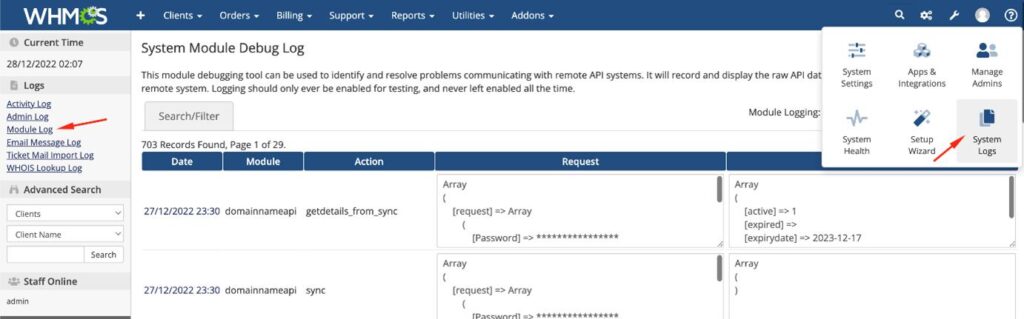 !! We recommend that the system log is closed for daily use in terms of system performance. For detailed information : Whmcs Logging