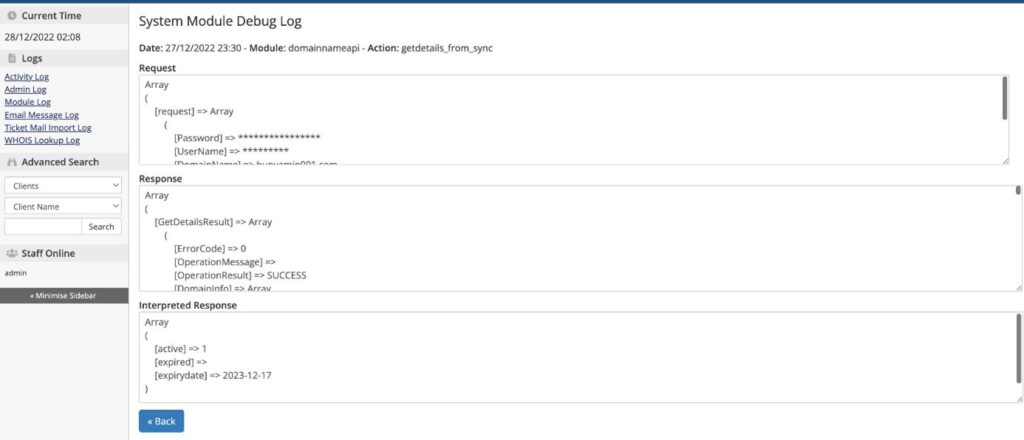 To activate debugging management, click “Utilities // Logs // Module Log” link.