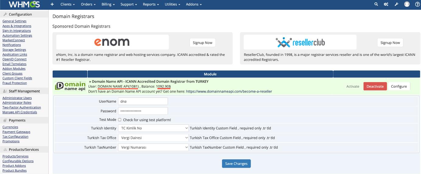 This documentation describes how to integrate your DomainNameAPI account into WHMCS software.