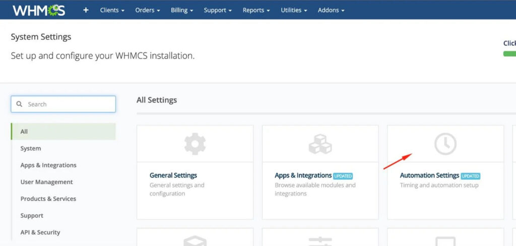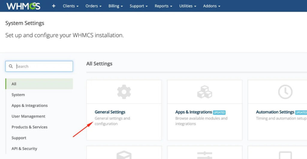 After uploading the files, from the WHMCS administration panel, go to the System Settings Section,